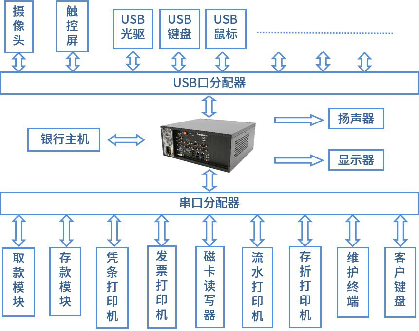 根據客戶需求,富士康Ennoconn 提供了客制化完整解決方案。每臺ATM&VTM機里都有一臺主機/或主板作為核心,Ennoconn 3U高效能多USB多串口工控機即為它的核心,它控制著ATM&VTM內部多個智能模塊諸如:取款模塊、存款模塊、磁卡讀寫模塊、憑條打印機、流水打印機、攝像頭、顯示模塊、語音模塊等等,憑借自身強大的運算能力以及可靠穩定性,確保ATM&VTM設備可以7 x 24h 穩定不間斷運行。
